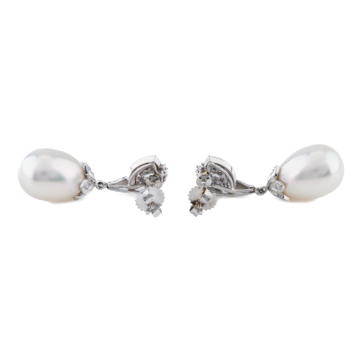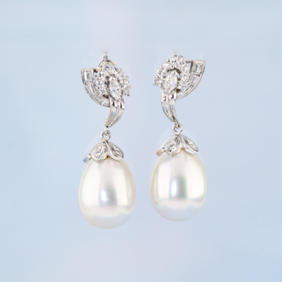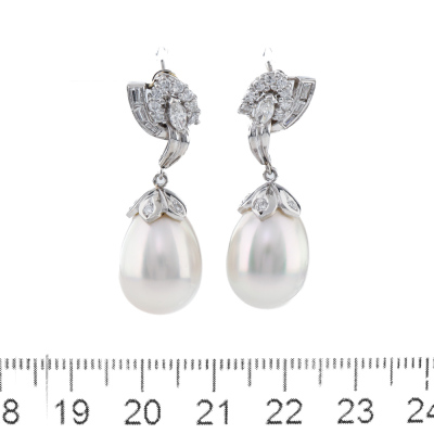 Pearl and Diamond drop earrings with South Pearls approximately from 11.8mm - 12.0mm and round, baguette & marquise cut Natural Diamonds totalling 0.70ct (Estimated grading: G SI). Platinum - 900 and 18ct white gold backs. Weight: 14.9g. (Pre-owned)