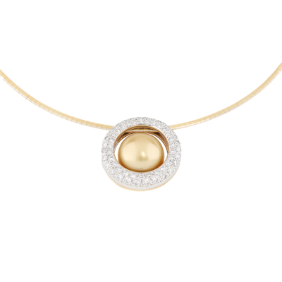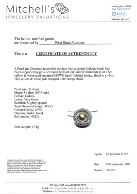 Pearl and Diamond reversable pendant with centre Golden South Sea Pearl of 11.8mm and round Natural Diamonds totalling 0.85ct (Estimated grading: G VS). 18ct white & yellow gold with 42cm 18ct white & yellow gold reversable Omega chain. Weight: 17.4g. With Certificate #421583. (Pre-owned)