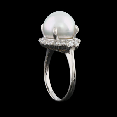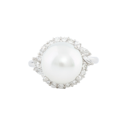 Pearl and Diamond ring with centre South Sea Pearl of 11.8mm and round & marquise cut Natural Diamonds totalling 0.58ct (Estimated grading: GHI VS). Platinum - 900. Ring size: O. Band width: 2.3mm - 2.1mm. Weight: 11.3g. (Pre-owned)