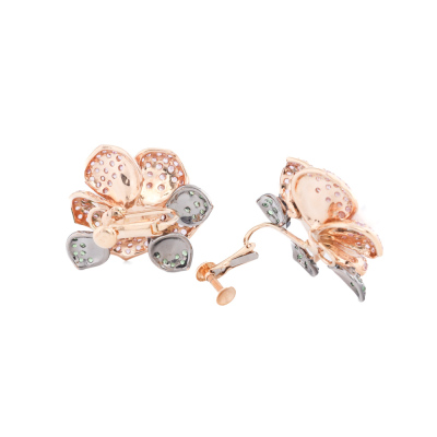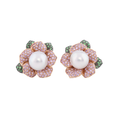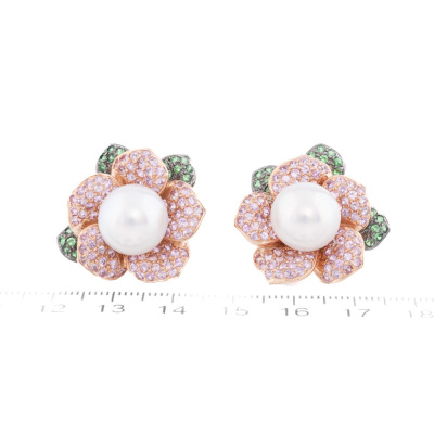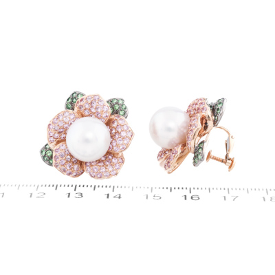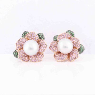 Floral design clip-on earrings (for non pieced ears) with 2 round South Sea Pearl of approximately 11.8mm, round Natural Pink Sapphires totalling approximately 3.00ct and round Natural Tsavorite Garnet totalling approximately 0.40ct. 18ct rose gold with black rhodium plating. Weight: 23.4g. With Certificate #421259. (Pre-owned)