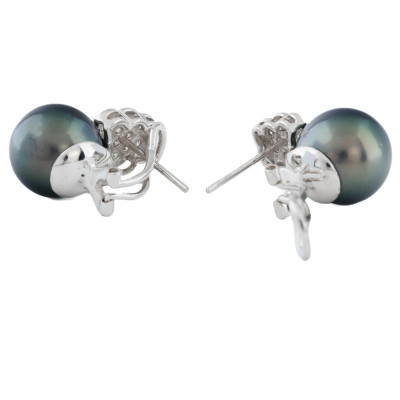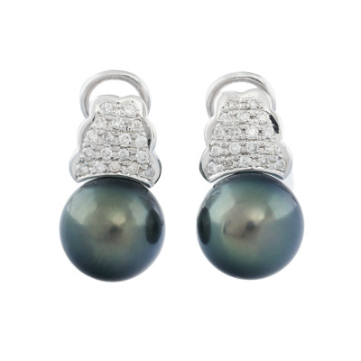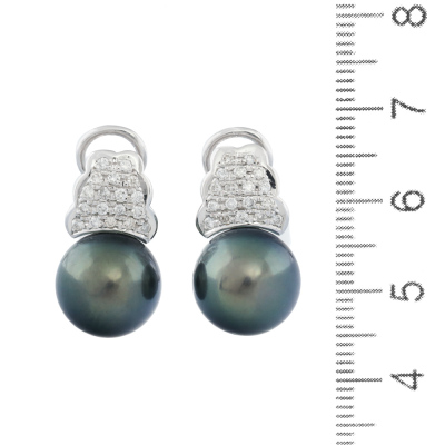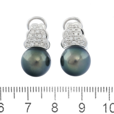 Pearl and Diamond clip-on earrings (for pierce ears) with Tahitian Pearl approximately of 11.8mm and round Natural Diamonds totalling 0.36ct (Estimated grading: H SI). 18ct white gold. Weight: 10.2g. (Pre-owned)
