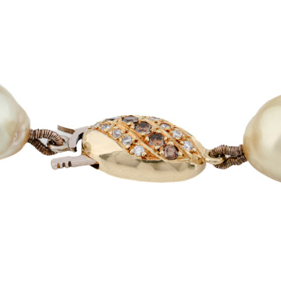 Pearl strand necklace with 32 multi-shape Light Golden South Sea Pearls of 10.0mm - 12.0mm. 18ct & 9ct yellow gold clasp (XRF tested, stamped '750')with round Natural White & Brown Diamonds totalling approximately 0.20ct. Length: 43.5cm. Weight: 58.4g.