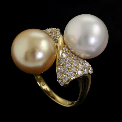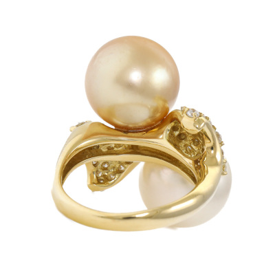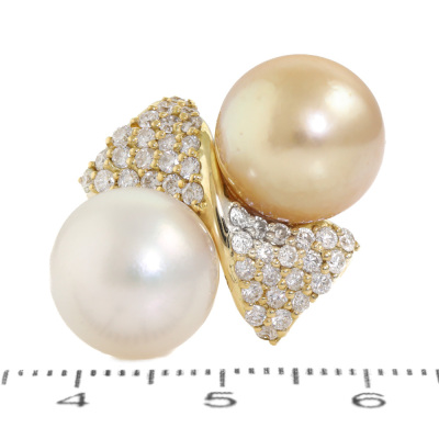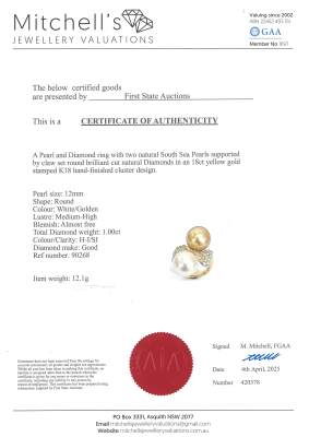 Pearl and Diamond ring with 2 South Sea Pearls of 12.1mm & 12.0mm and round Natural Diamonds totalling 1.00ct (Estimated grading: H-I SI). 18ct yellow gold. Ring size K1/2. Band width: 2.3mm - 3mm. Weight: 12.1g. With Certificate #420378. (Pre-owned)
