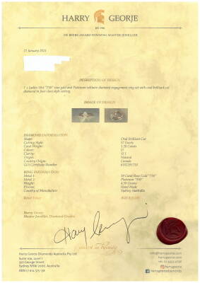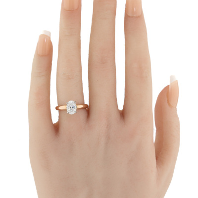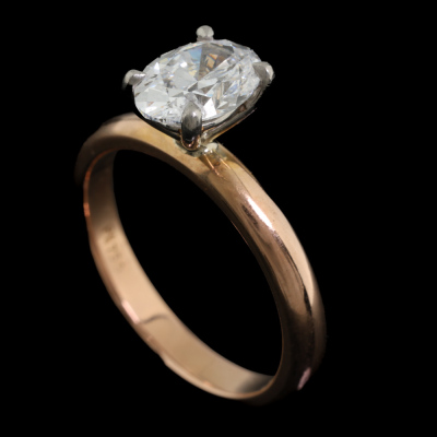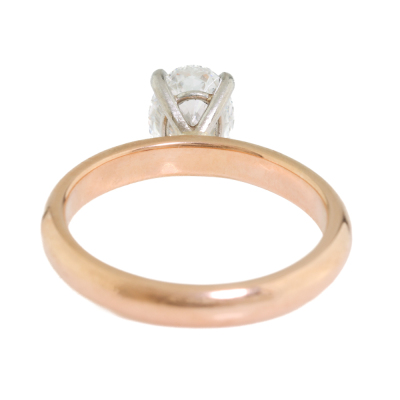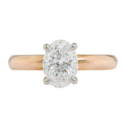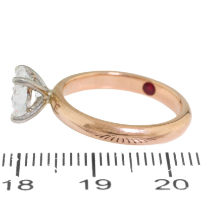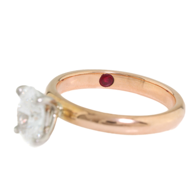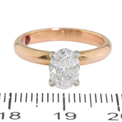 Diamond solitaire ring with oval Natural Diamond of 1.20ct (With GIA Report graded as D SI1 #6352291758). 18ct rose gold and platinum 900 (XRF tested, with stamp 'Pt 750'). With a hidden 2mm round Natural Ruby set inside the band. Ring size L1/4. Band width: 2.9mm. Weight: 4.6g. With Harry George Valuation Certificate dated 21/01/21. (Pre-owned)