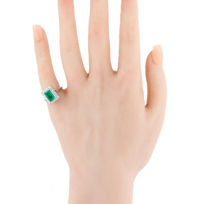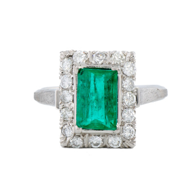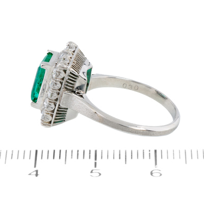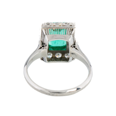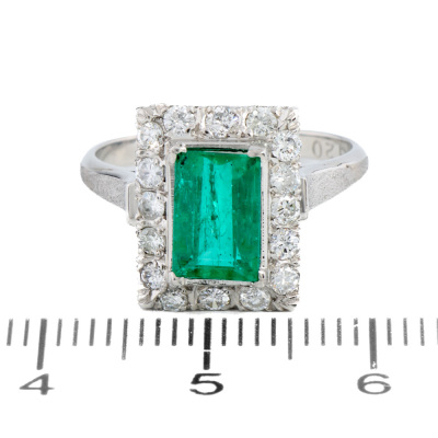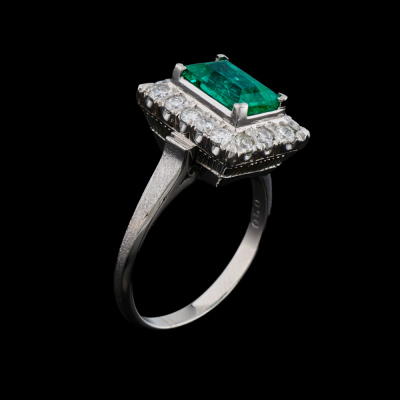 Emerald and Diamond ring with baguette cut Natural totalling 1.20ct and round Natural Diamonds totalling 0.30ct (Estimated grading: G-H SI). Platinum - 850. Ring size K. Band width: 1.8mm - 2.3mm. Weight: 4.7g. (Pre-owned)