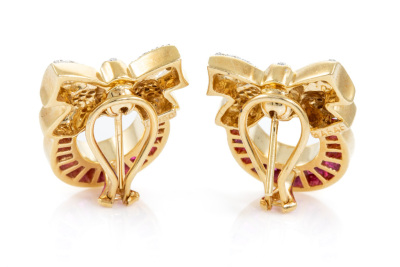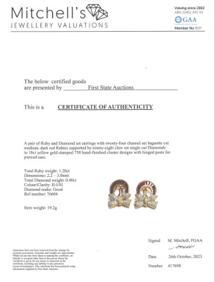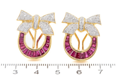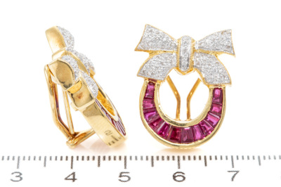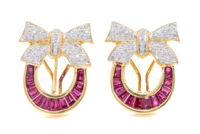 Ruby and Diamond clip-on earrings (for pierced ears with foldable posts) with baguette cut Natural Rubies totalling 1.20ct and round Natural Diamonds totalling 0.40ct (Estimated grading: H-I SI). 18ct yellow gold. Weight: 19.2g. Dimensions: 25.0mm x 18.0mm. With Certificate #76684. (Pre-owned)
