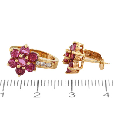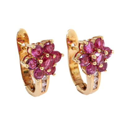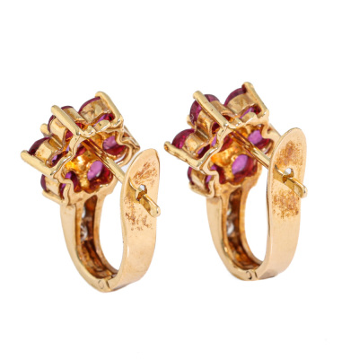Clip-on earrings (for pierced ears) with round Natural Rubies totalling approximately 1.20ct and round Natural Diamonds totalling 0.12ct. 18ct yellow gold. Weight: 4.1g. (Pre-owned)