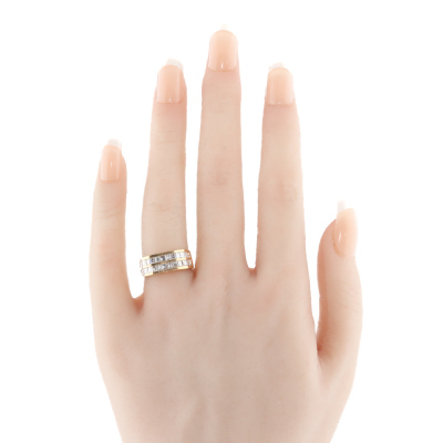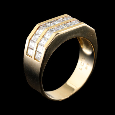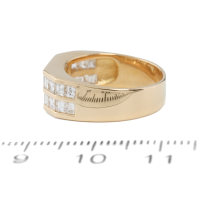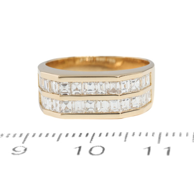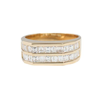 Diamond ring with 26 baguette cut Natural Diamonds totalling 1.21ct (Estimated grading: G VS). 18ct yellow gold. Ring size J3/4. Band width: 4.6mm - 6.0mm. Weight: 5.6g. (Pre-owned)