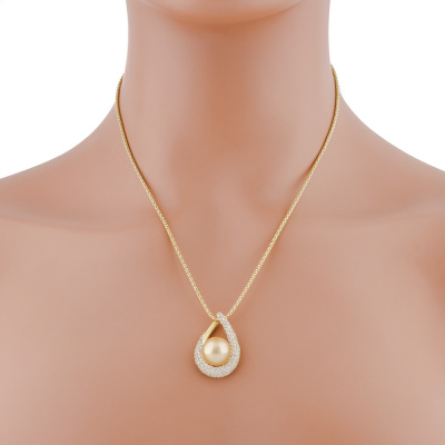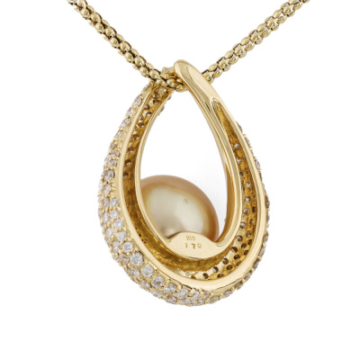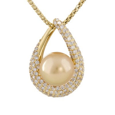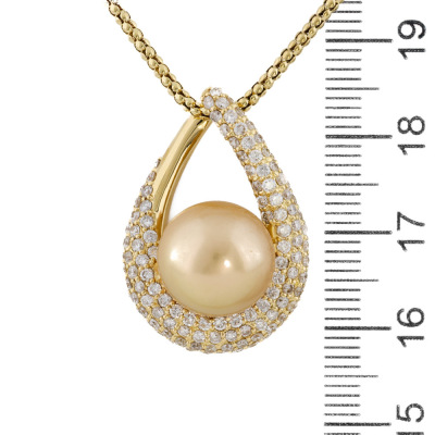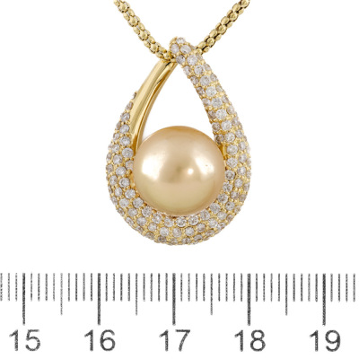 Pearl and Diamond pendant with Golden South Sea Pearl of 12.1mm and round Natural Diamonds totalling 1.70ct (Estimated grading: GH SI-P1). 18ct yellow gold and 45.5cm 18ct yellow gold chain. Weight: 13.4g. (Pre-owned)