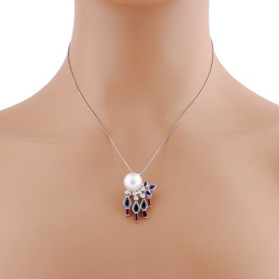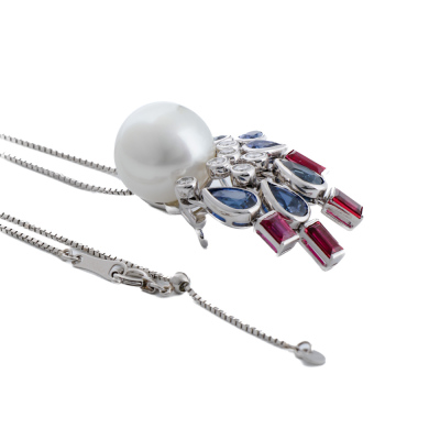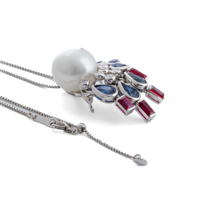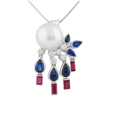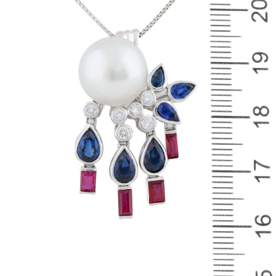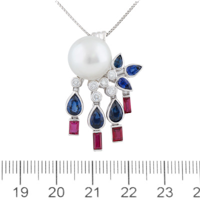 Pearl, Sapphire, Ruby and Diamond pendant with South Sea Pearl of 12.2mm, pear shape Natural Blue Sapphires totalling 2.58ct, baguette cut Natural Rubies totalling 1.01ct and round Natural Diamonds totalling 0.26ct. Platinum - 900 with 44.5cm Platinum 850 adjustable chain. Weight: 13.5g. (Pre-owned)