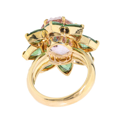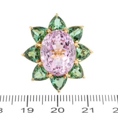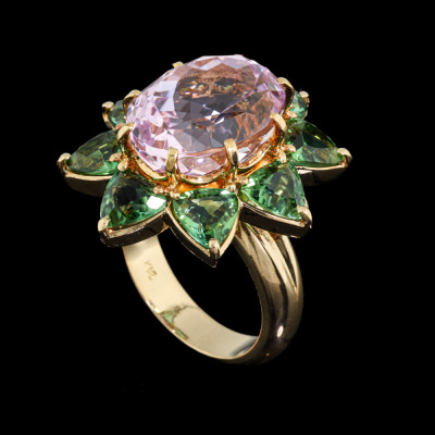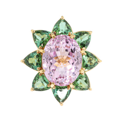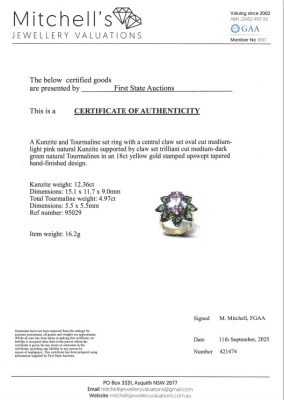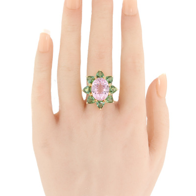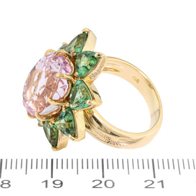Kunzite and Tourmaline ring with centre oval shape Natural Kunzite of 12.36ct and 8 trilliant cut Natural Green Tourmaline totalling 4.97ct. 18ct yellow gold. Ring size M. Band width: 4.1mm - 5.0mm. Weight: 16.2g. With Certificate #421474. (Pre-owned)