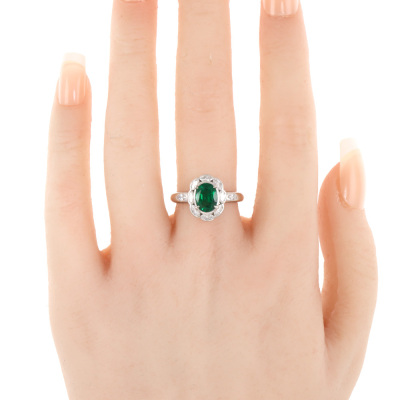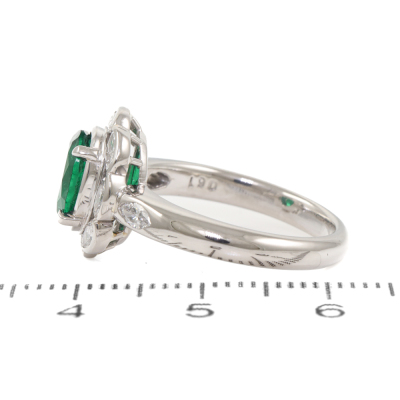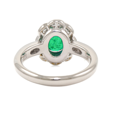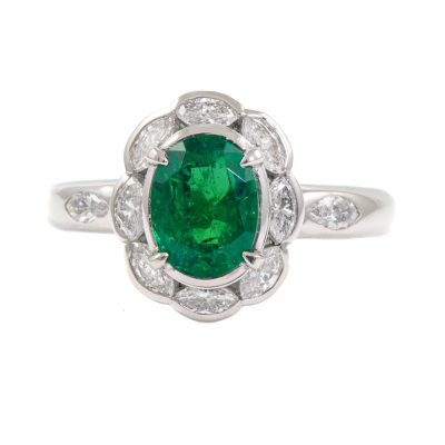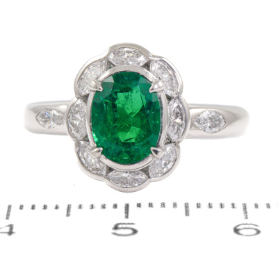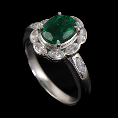 Emerald and Diamond ring with oval shape Natural Emerald of 1.23ct and marquise cut Natural Diamonds totalling 0.61ct (Estimated grading: G VS). Platinum - 900. Ring size L½. Band width: 2.7mm - 3mm. Weight: 7.4g. (Pre-owned)
