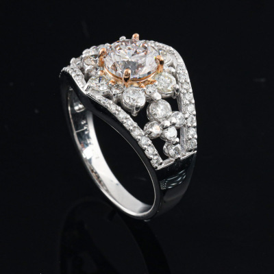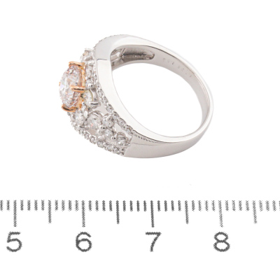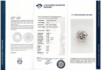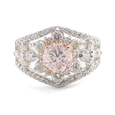 Diamond dress ring with centre round Natural Pink Diamond of 1.23ct (GSL graded as Natural Faint Pink P1 #AA70531) and surrounding of round Natural Diamonds totalling 1.02ct (Estimated grading: HIJ SI). Platinum - 950 and 18ct rose gold. Ring size L1/2. Band width: 2.6mm - 5.0mm. Weight: 8.1g. (Pre-owned)
