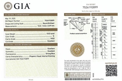 Diamond stud earrings with 2 round brilliant cut Natural Diamonds totalling 1.24ct (with GIA Dossier Reports graded as G VVS2 #1525147961, 7526192899). 18ct white gold. Weight: 1.5g. (New)