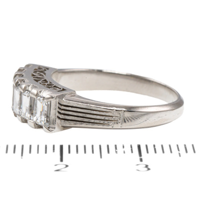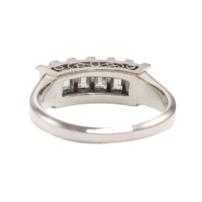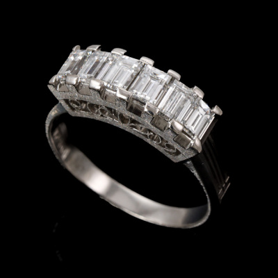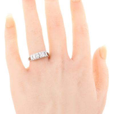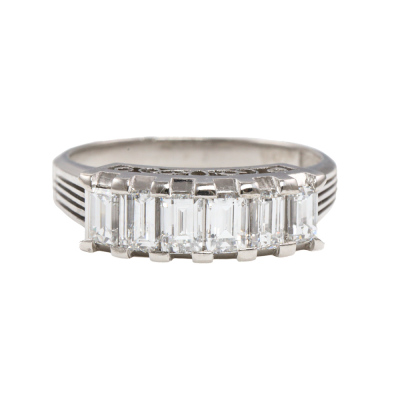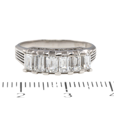Diamond eternity ring with 6 baguette cut Natural Diamonds totalling 1.24ct (Estimated grading: G VS). Platinum - 900. Ring size: N1/2. Band width: 2.3mm - 3.9mm. Weight: 6.5g. (Pre-owned)