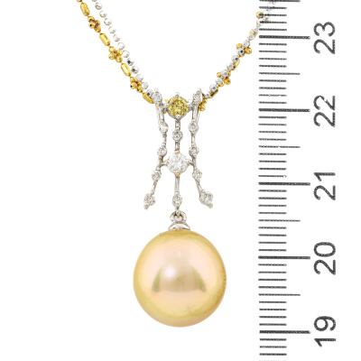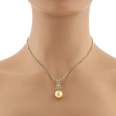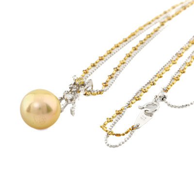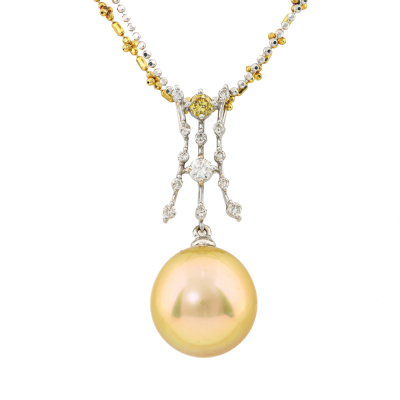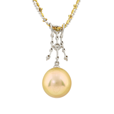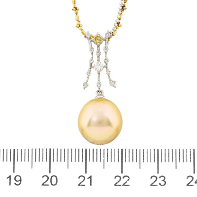 Pearl and Diamond pendant with a Golden South Sea Pearl approximately of 12.4mm and round Natural yellow & white Diamonds totalling 0.20ct. 18ct yellow and white gold double chain. Length: 47cm. Weight: 8.9g. (Pre-owned)