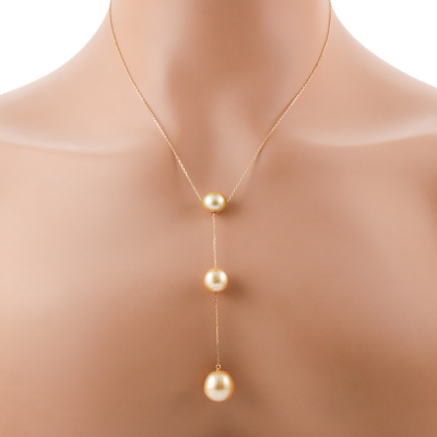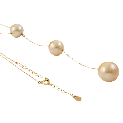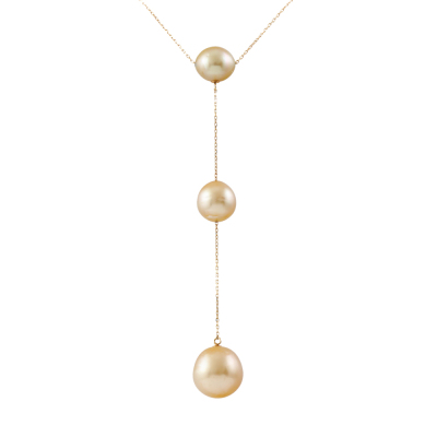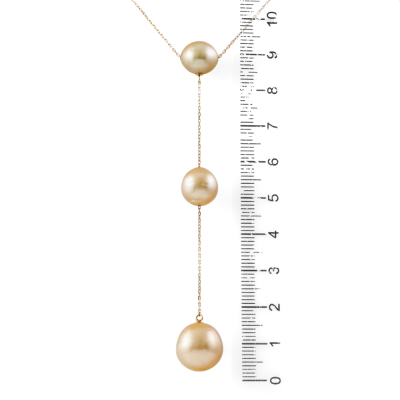 Pearl drop pendant with 3 Golden South Sea Pearls of 12.5mm, 10.0mm & 9.2mm. 18ct yellow gold with 18ct yellow gold attached chain. Adjustable max length: 50cm. Weight: 7.4g.