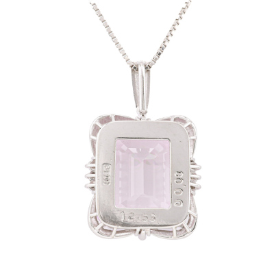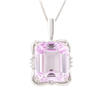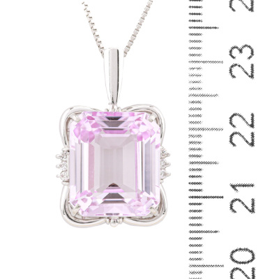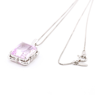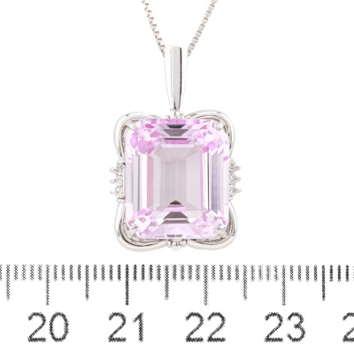 Kunzite and Diamond pendant with emerald cut Natural Kunzite of 12.53ct and round Natural Diamonds totalling 0.08ct. Platinum - 900 with 45cm Platinum - 850 chain. Weight: 10.0g. (Pre-owned)