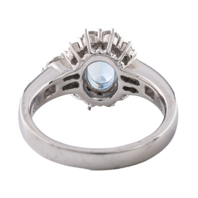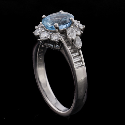 Aquamarine and Diamond ring with centre oval shape Natural Aquamarine of 1.25ct and round & marquise cut Natural Diamonds totalling 1.11ct (Estimated grading: G VS-SI). Platinum - 900. Ring size M. Band width: 2.7mm - 3.2mm. Weight: 8.0g.