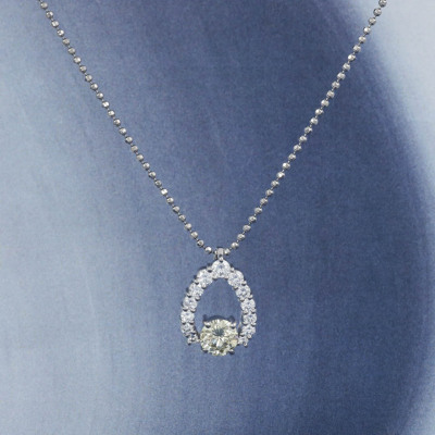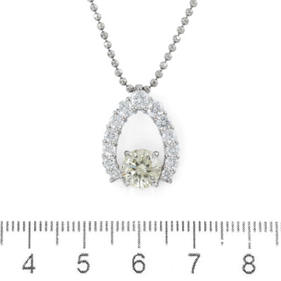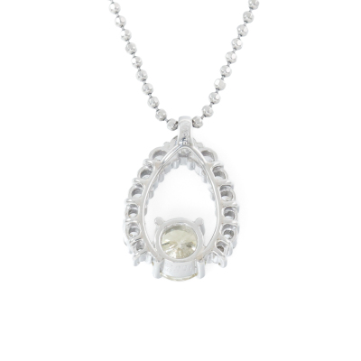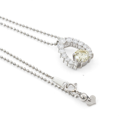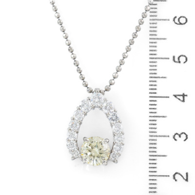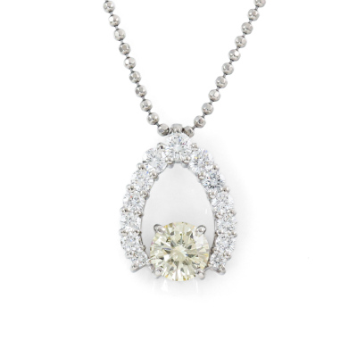 Diamond pendant with a centre round Natural Yellow Diamond of 1.25ct (Estimated grading: Light Yellow SI1) and surrounding of round Natural White Diamonds totalling 0.97ct (Estimated Grading: G SI). Platinum - 900 and Platinum - 850 50cm chain. Weight: 11.5g. With Certificate #420337. (Pre-owned)