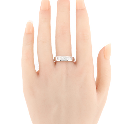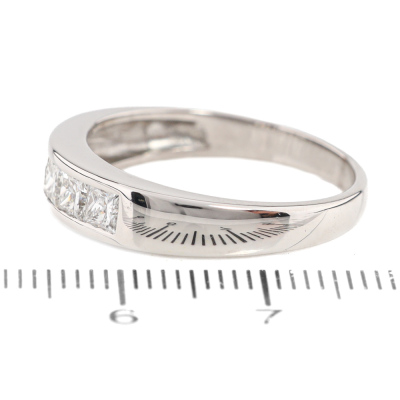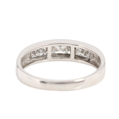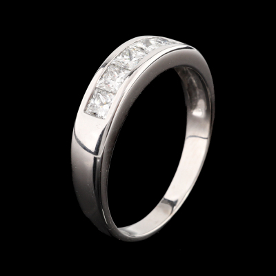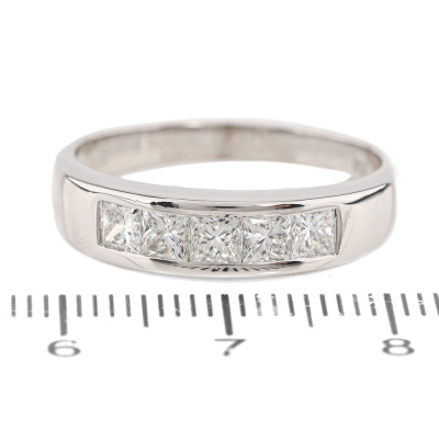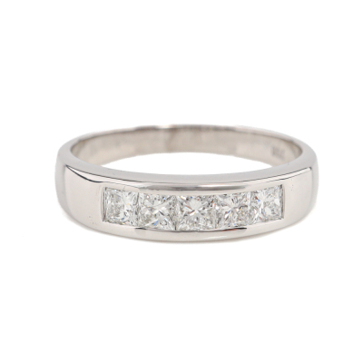 Diamond eternity ring with 5 Princess cut Natural Diamonds totalling approximately 1.25ct (Estimated grading: G-H VS). 18ct white gold. Ring size: S1/2. Ring band: 2.6mm - 4.2mm. Weight: 5.1g. (Pre-owned)