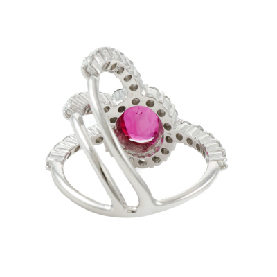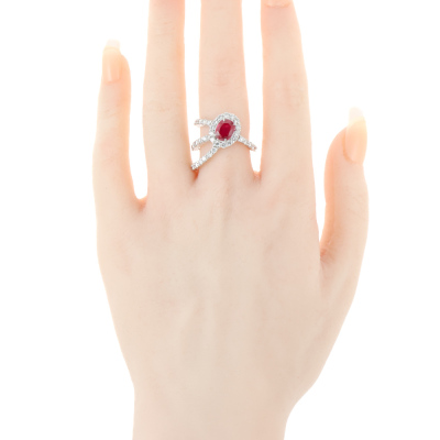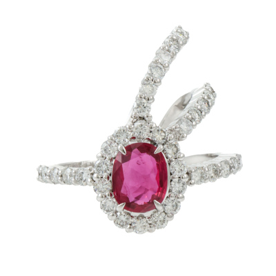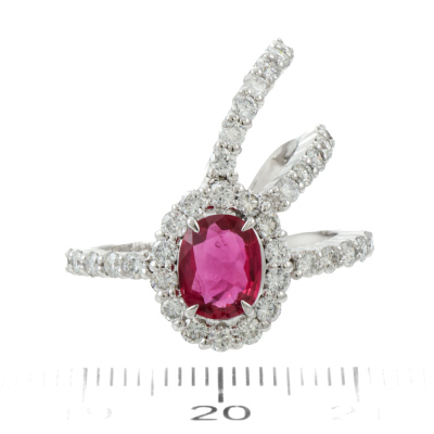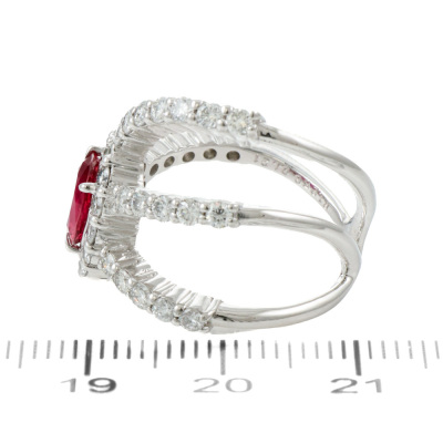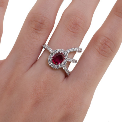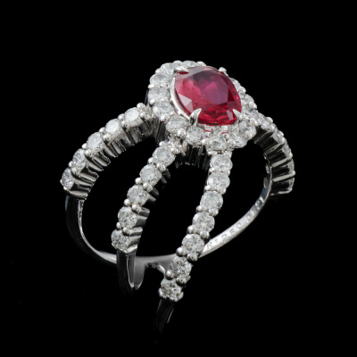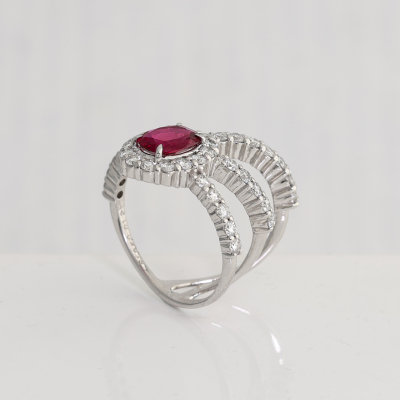 Ruby and Diamond ring with oval shape Natural Ruby of 1.25ct and round Natural Diamonds totalling 1.21ct (Estimated grading: G-H VS-SI). Platinum - 900. Ring size M. Band width: 1.5mm - 1.8mm. Weight: 8.1g.