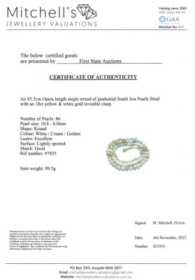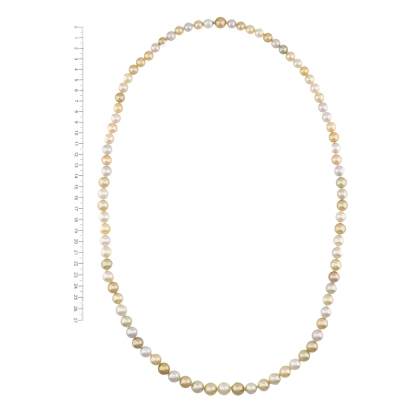 Opera Length Pearl strand necklace with 86 graduated round multicolour South Sea Pearls from 10.8mm - 8.0mm. 18ct yellow and white gold invisible Pearl clasp. Length: 85.5cm. Weight: 99.5g. With Certificate #421910. (As New)
