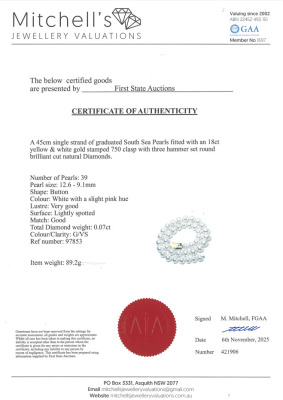 Pearl Strand Necklace with 39 graduated button shape South Sea Pearls of 12.6mm - 9.1mm. 18ct yellow and white double sided clasp with 3 round Natural Diamonds totalling approximately 0.07ct. Length: 45cm With Certificate #421906.