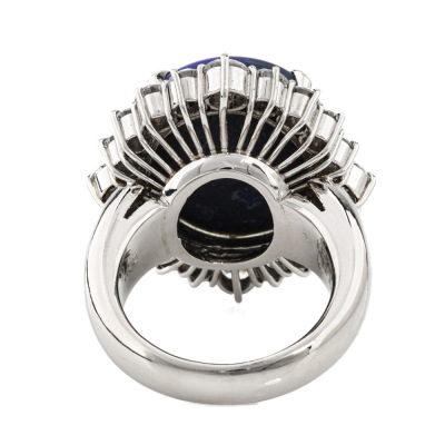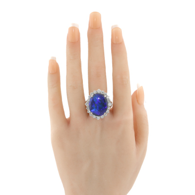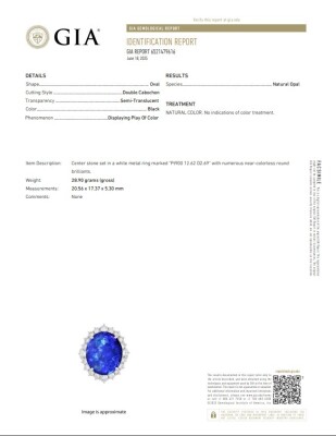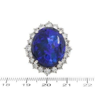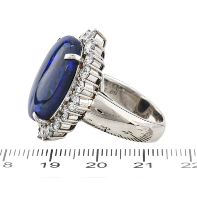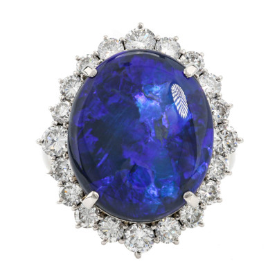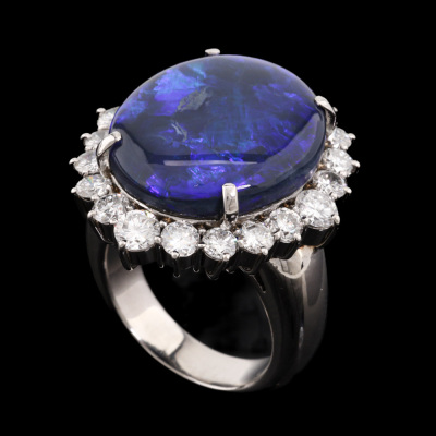 Opal and Diamond ring with oval double cabochon cut Black Opal of 12.62ct and round Natural Diamonds totalling 2.69ct (Estimated grading: G VS-SI). Platinum - 900. Ring size: N1/4. Band width: 4.6mm - 6.6mm. Weight: 28.9g. With GIA Report #6521479616.(Pre-owned)