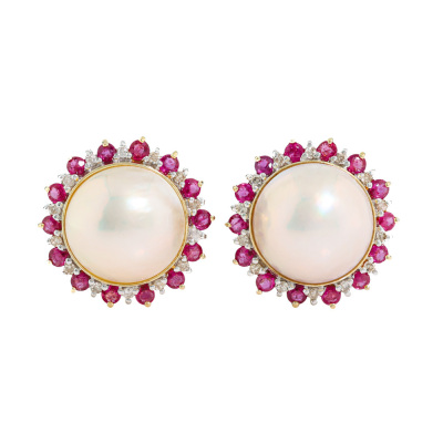 Clip-on earrings (for pierced ears) with Mabe Pearls of 12.6mm, round Natural Rubies totalling approximately 1.10ct and round Natural Diamonds totalling approximately 0.28ct. 14ct yellow gold. Weight 8.3g. (Pre-owned)