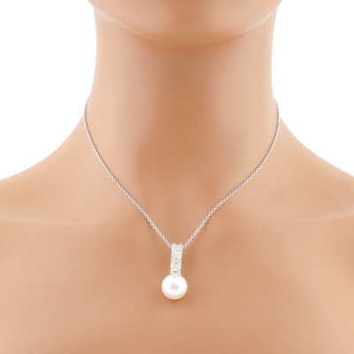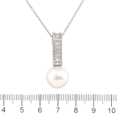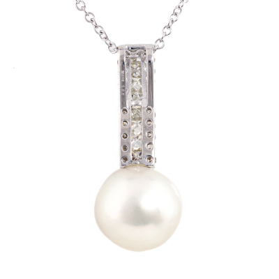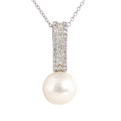 Pearl and Diamond pendant with a South Sea Pearl of 12.6mm and round & princess cut Natural Diamonds totalling 1.00ct (Estimated grading: HIJ VS ). 18ct white gold with 40.0cm 18ct white gold chain. Weight: 7.0g. (Pre-owned)