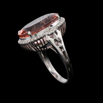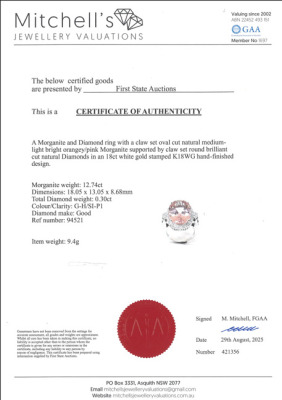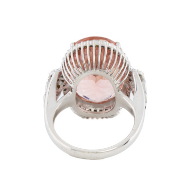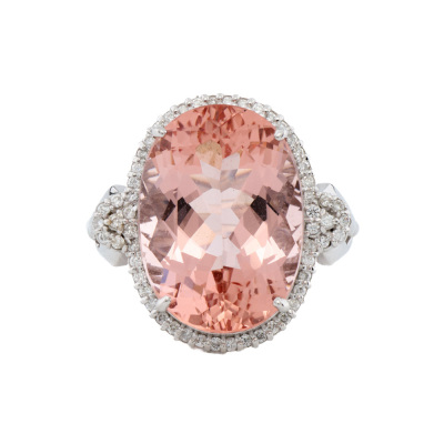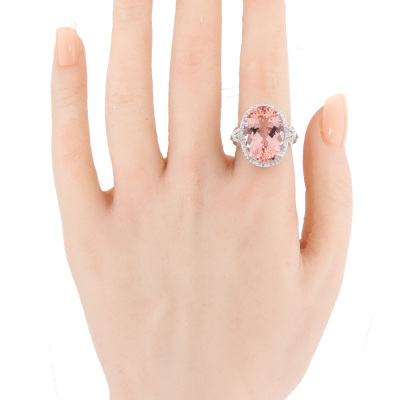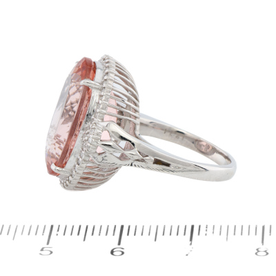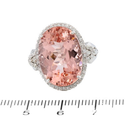 Morganite and Diamond ring with centre oval shape Natural Morganite of 12.74ct and round Natural Diamonds totalling 0.30ct (Estimated grading: G-H SI-P1). 18ct white gold. Ring size L. Band width: 2.3mm-2.5mm. Weight: 9.4g. With Certificate #421356. (Pre-owned)