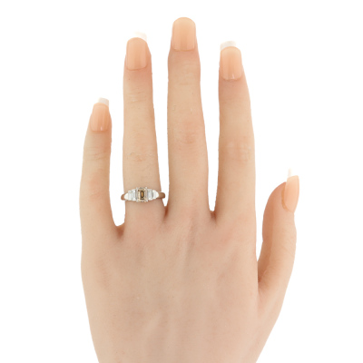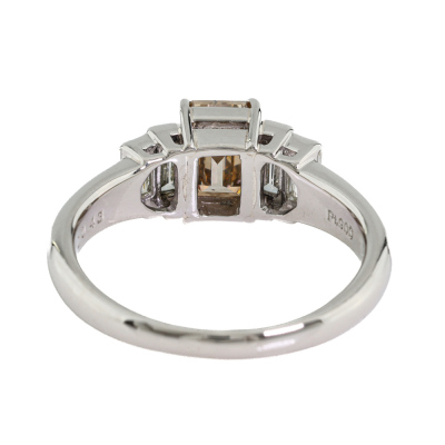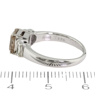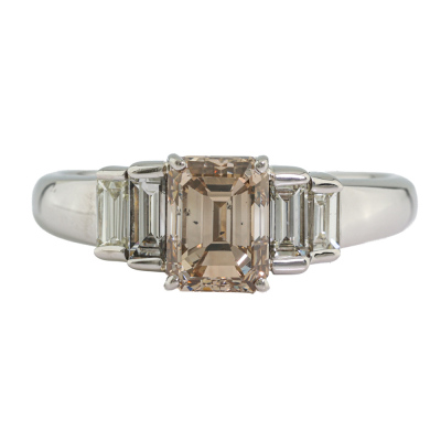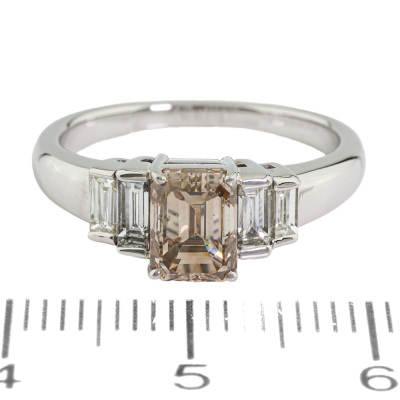 Diamond ring with a centre emerald cut Natural Diamond of 1.27ct (Estimated grading: Champagne SI) and 4 baguette cut Natural white Diamonds totalling 0.43ct (Estimated grading: I-J VS). Platinum - 900. Ring size K1/2. Band width: 1.8mm - 3.5mm. Weight: 5.2g. (Pre-owned)
