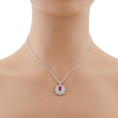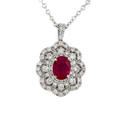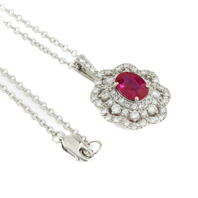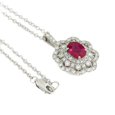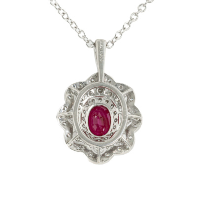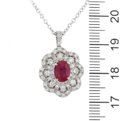 Ruby and Diamond pendant with an oval shape Natural Ruby of 1.27ct and round Natural Diamonds totalling 1.11ct (Estimated grading: G-H SI). Platinum - 900 with 40cm 18ct white gold chain. Weight: 5.9g. (Pre-owned)