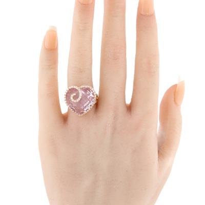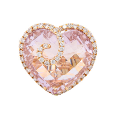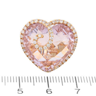 Kunzite and Diamond ring with centre heart shape checkerboard cut Natural Kunzite of 12.85ct and round Natural Diamonds totalling 0.76ct (Estimated grading: J SI). 18ct yellow gold. Ring size: L 1/4. Band width: 3.1mm - 5.1mm. Weight: 9.5g. (Pre-owned)