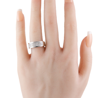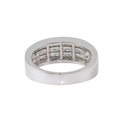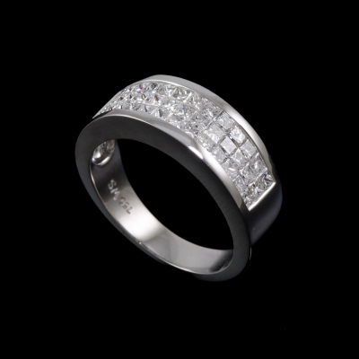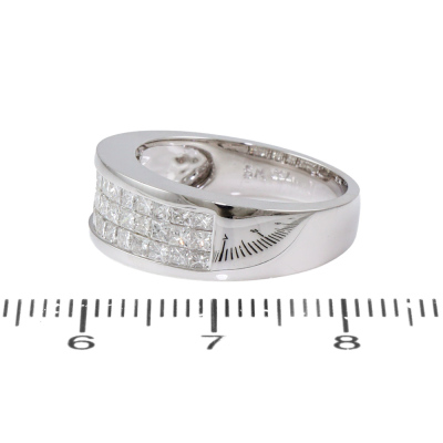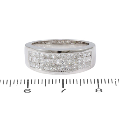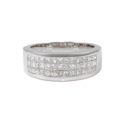 Diamond dress ring with 30 invisibly set princess cut Natural Diamond totalling 1.28ct (Estimated grading: G-H VS-SI). 18ct white gold. Ring size M. Band width: 3.6mm - 5.4mm. Weight: 6.3g. (As new)