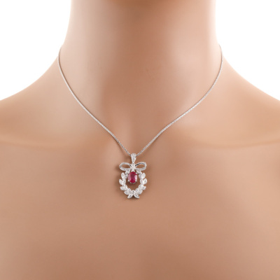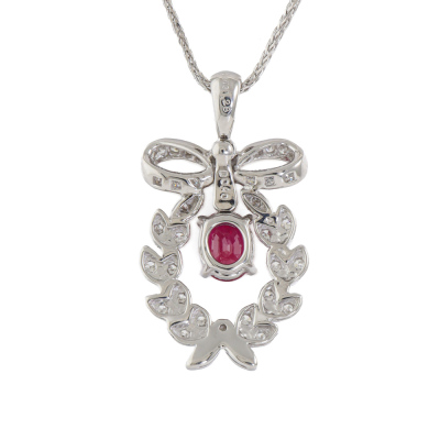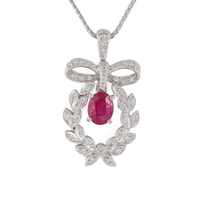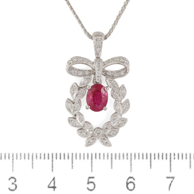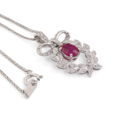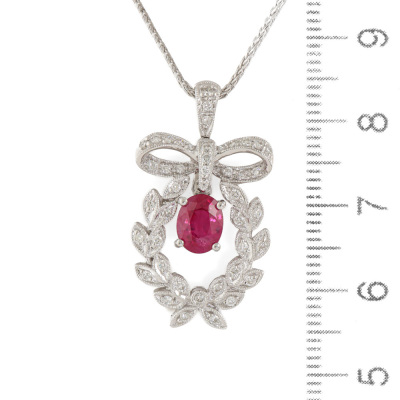 Ruby and Diamond necklace with round Natural Ruby of 1.28ct and round Natural Diamonds totalling 0.40 (Estimated grading: H-I SI-P1). 18ct white gold and 40cm 18ct white gold chain. Weight: 6.2g. (Pre-owned)