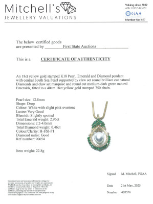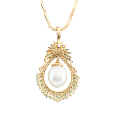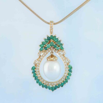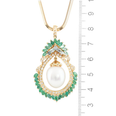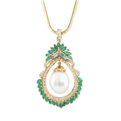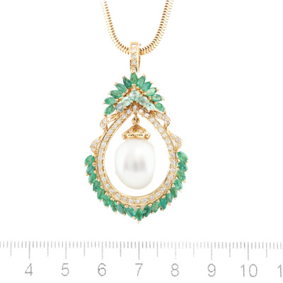Pearl, Emerald and Diamond pendant with centre drop shape South Sea Pearl of approximately 12.8mm, surrounding round and marquise cut Natural Emeralds totalling 2.96ct and round Natural Diamonds totalling 0.46ct (Estimated grading: H-I SI-P1. 18ct yellow gold with 40cm 18ct yellow gold chain. Weight: 22.8g. With Certificate #420576. (Pre-owned)