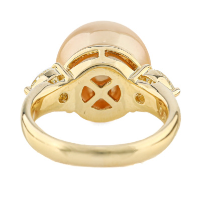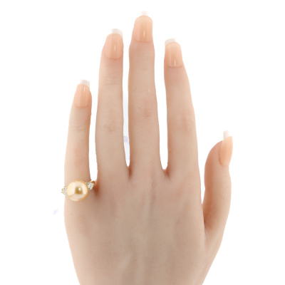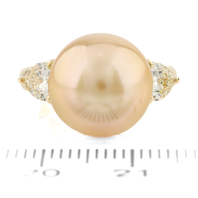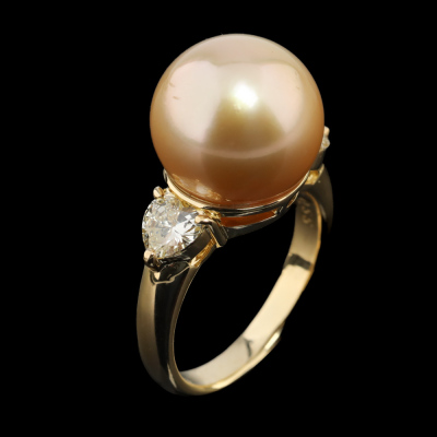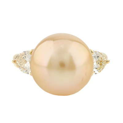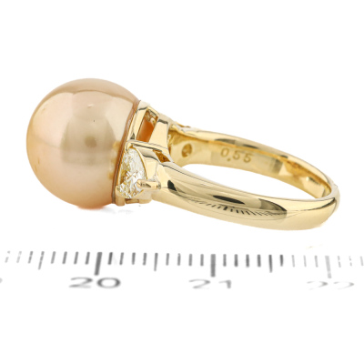 Pearl and Diamond ring with centre Golden South Sea Pearl of 12mm and two shoulder heart shape Natural Diamonds totalling 0.55ct (Estimated grading: Very Light Yellow VS-SI). 18ct yellow gold. Ring size I1/2. Band width: 2.7mm-3.6mm. Weight: 7.3g. (Pre-owned)