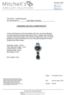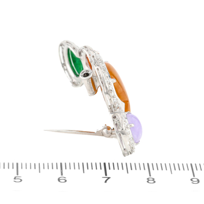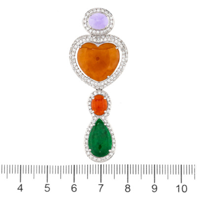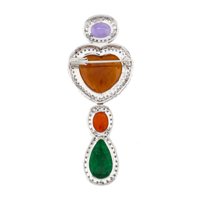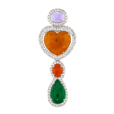 Jade and Diamond brooch/pendant with multi-shape cabochon cut Natural Lavender, and Brownish Orange, Red & Green Natural Jadeite Jade - Type A totalling 13.05ct (Jade shapes including oval, heart and drop) and round Natural Diamonds totalling 1.92ct (Estimated grading: G-H SI). 18ct white gold. Weight: 10.4g. With Certificate #421999. (Pre-owned)