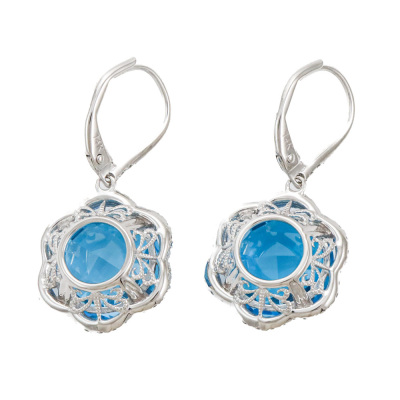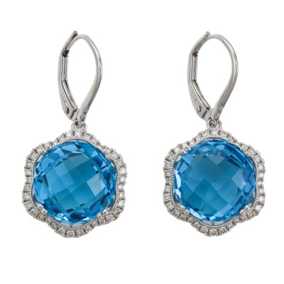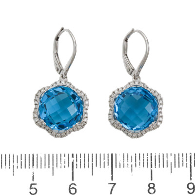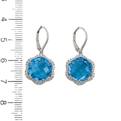 Topaz and Diamond leverback earrings with oval shape checkerboard natural Topazes totalling 13.05ct and round natural Diamonds totalling 0.38ct (Estimated grading: H SI). 14ct white gold. Weight: 5.6g. (New)