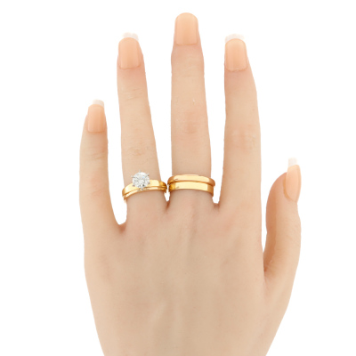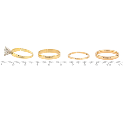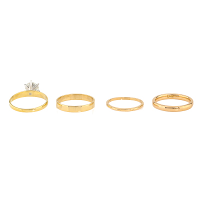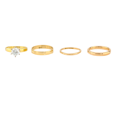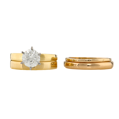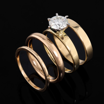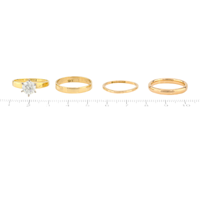 Diamond ring and 3 band set. 1) Diamond solitaire ring with a round brilliant cut Natural Diamond of 1.30ct (Estimated grading: I-J VS). Ring size O3/4. Band width: 1.9mm-3.4mm. 2) Three band rings. Ring size: L1/2, P, N1/2. Band width: 1.3mm, 3.3mm & 3mm. 18ct yellow and rose gold. Total weight: 11.4g. (Pre-owned)