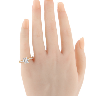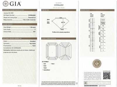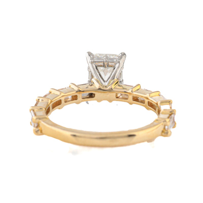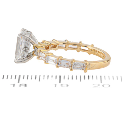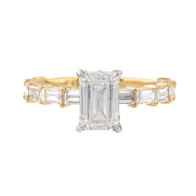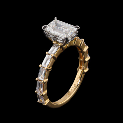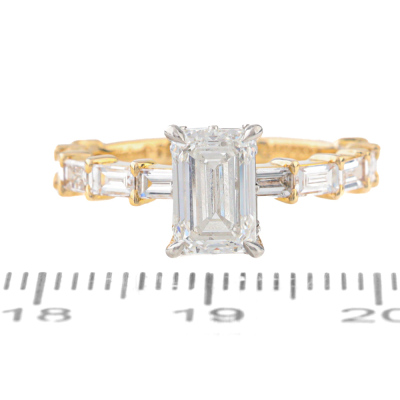 Diamond solitaire ring with centre emerald cut Natural Diamond of 1.30ct (With GIA Report graded as: F VS1 #2205846082) and baguette cut Natural Diamonds totalling approximately 0.90ct (Estimated grading: G-H VS). 18ct Yellow gold and Platinum 950. Ring size: I/14 - Ring resizing is not recommended. Band width: 1.9mm. Weight: 3.6g. (Pre-owned)