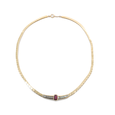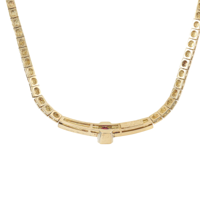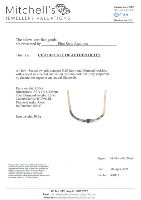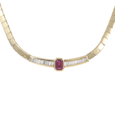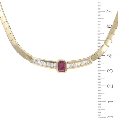Ruby and Diamond necklace with emerald cut Natural Ruby of 1.30ct and baguette cut Natural Diamonds totalling 1.20ct (Estimated grading: HIJ VS-SI). 18ct yellow gold. Length: 42cm. Weight: 30.5g. With Certificate #420418. (Preowned)
