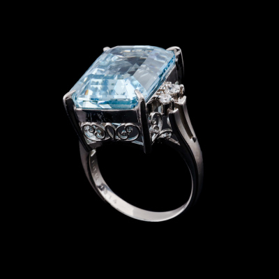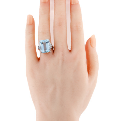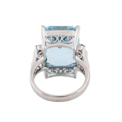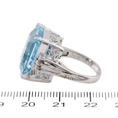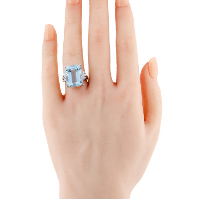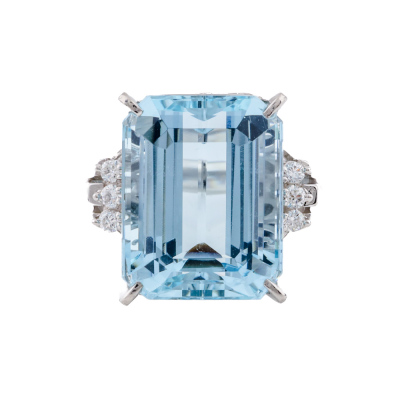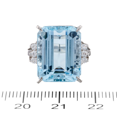 Aquamarine and Diamond ring with centre emerald cut Natural Aquamarine of 13.14ct and 6 round Natural Diamonds totalling 0.15ct. Platinum - 900. Ring size K1/2. Band width: 2.6mm-3.0mm. Weight: 11.2g. (Pre-owned)
