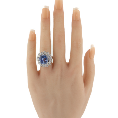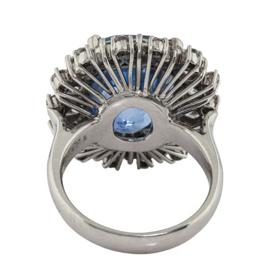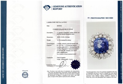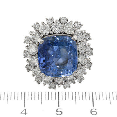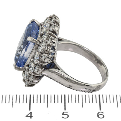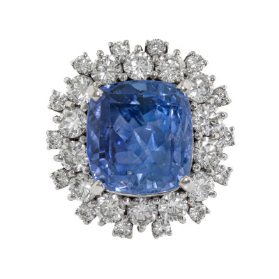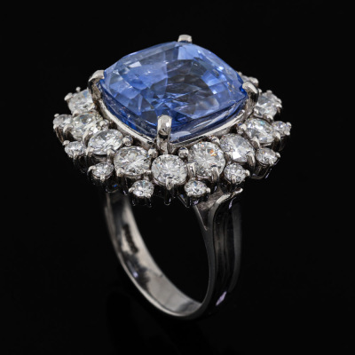 Sapphire and Diamond ring with centre cushion cut unheated Ceylon Natural Blue Sapphire of 13.17ct (With GSL Report #AA71915) and round Natural Diamonds totalling 2.58ct (Estimated grading: GHI VS-SI). Platinum - 900. Band width: 3.3mm