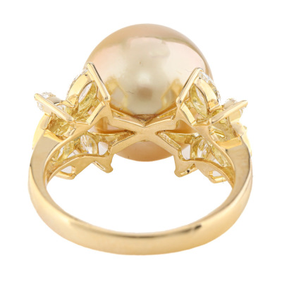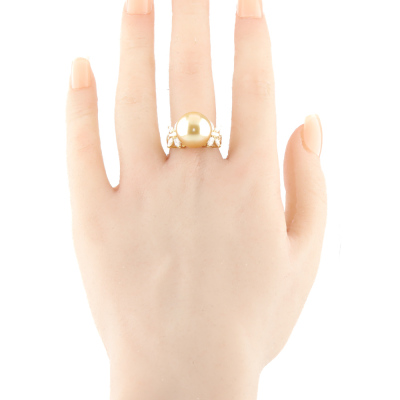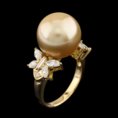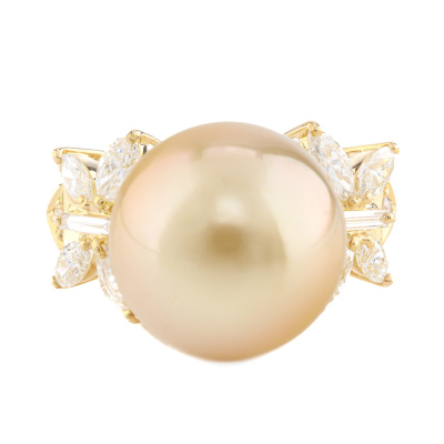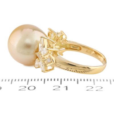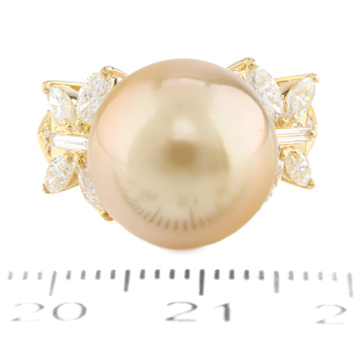 Pearl and Diamond ring with Golden South Sea Pearl approximately of 13.1mm and round, marquise and baguette cut Natural Diamonds totalling 0.77ct (Estimated grading: H-J SI). 18ct yellow gold. Ring size L½. Band Width: 2.3mm -3.0mm. Weight: 7.4g. (pre-owned)