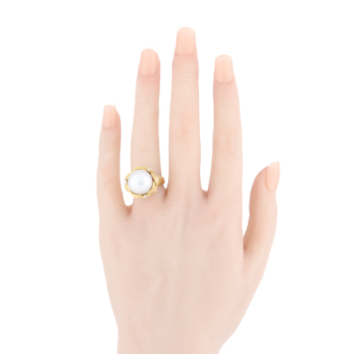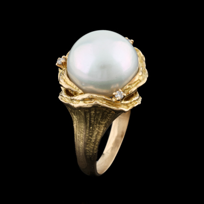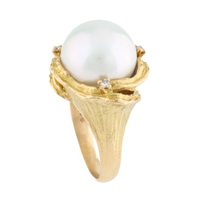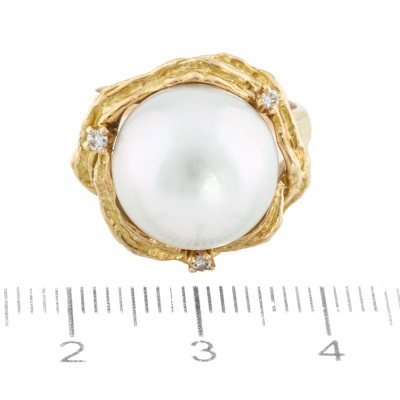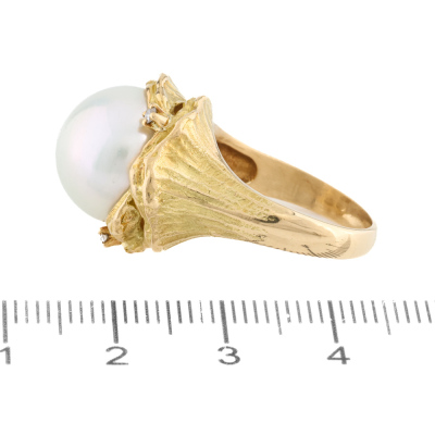 Pearl & Diamond ring with South Sea Pearl of 13.1mm and 3 round Natural Diamonds totalling 0.06ct. 18ct yellow gold. Ring size K1/2. Band width: 2.6mm - 4.3mm. Weight: 11.6g. (Pre-owned).