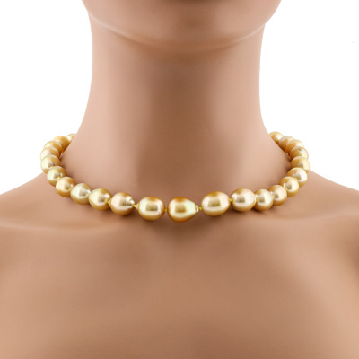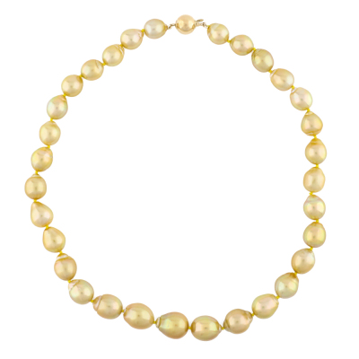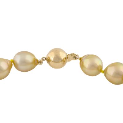 Pearl strand necklace with 31 oval & drop shape graduated Golden South Sea Pearl from 13.2mm - 10mm. 14ct yellow gold 10mm ball clasp. Length: 46cm. Weight: 69.5g.