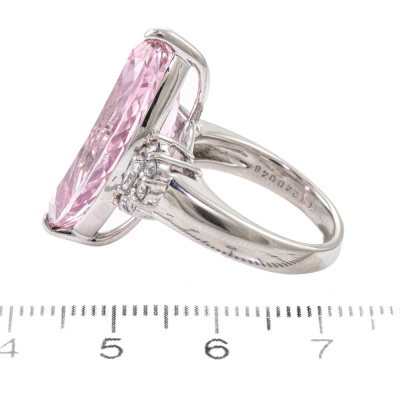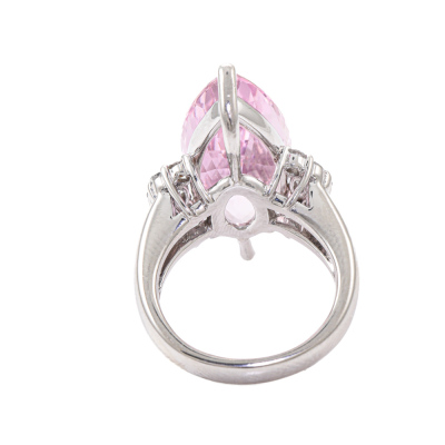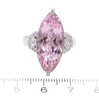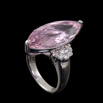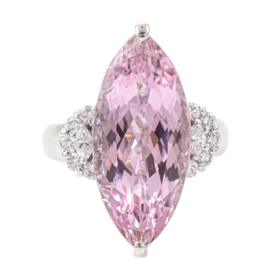 Kunzite and Diamond ring with centre marquise cut Natural Kunzite of 13.24ct and round & marquise cut Natural Diamonds totalling 0.48ct (Estimated grading: G VS). Platinum-900. Ring size L1/4. Band width: 3.1mm-4.5mm. Weight: 16.6g